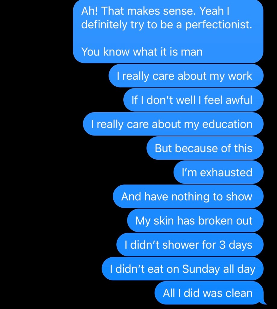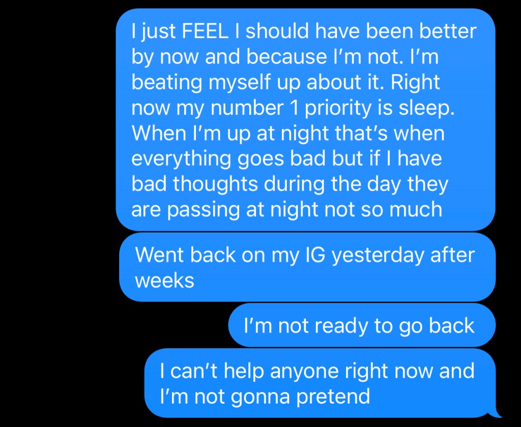 The even crazier part is I couldn’t bring myself to do them, or when I did do them, I panicked and overthought everything. I was so upset with myself for being that anxious because I had just gotten out of therapy in April. Still, Mental wellness isn’t linear; anything can happen, but that ultimately left my brain. I didn’t care. I kept questioning myself