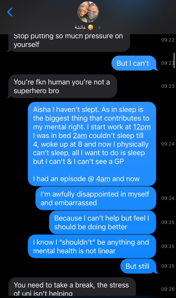 I was wrong to solely focus on University, I should have taken better care of myself, but I don’t regret any of this happening because had it not have happened, I wouldn’t learn so much about myself, though I tend to care about others I should always look out for me especially with how my mental well-being is setback anything too stressful, and I start spiralling. I am much better now and still working to better my mental well-being a lot of progress has happened and I am proud of myself for that!
