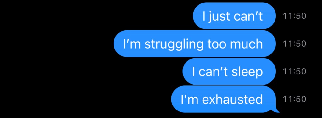 ”I am anxious, It’s 07:36 AM I can’t sleep. I am broke and I know sleep is important but I can’t sleep…I self harmed for the first time in a long time. If I slept well I’d be okay. I am broke, tired, anxious…depressed? but I gotta keep my A game. I was doing so good. I am back to square 1. 08:43 AM”
